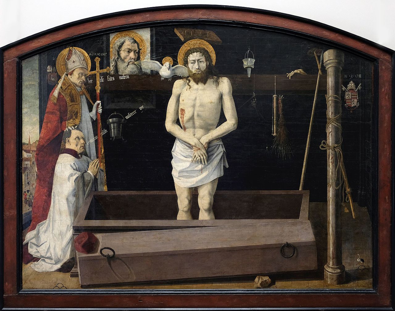 Sztuka religijna nie stroniła od obecności najbardziej tajemniczej postaci Trójcy Świętej, nadając Jej określony symbol. Tym symbolem było nieraz tchnienie, pocieszenie, podmuch wiatru niewidoczna, ale silna więź z człowiekiem, obrazowana gołębicą bądź językiem ognia. Ducha Świętego nie można zobaczyć, można odczuć jego zbawcze działanie, rzeczywistość niematerialną jaką jest życie. Chrystus Boleściwy, pokonujący śmierć jest pierwszoplanową postacią uwiecznioną przez anonimowego artystę w Ołtarzu namalowanym dla kościoła Świętego Marcellina w Boulbon, podarowanego prawdopodobnie przez kapitułę Saint-Agricol z Awinionu.